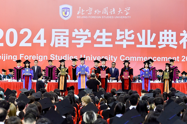 6月28日,北京外国语大学2024届学生毕业典礼在体育馆隆重举行。