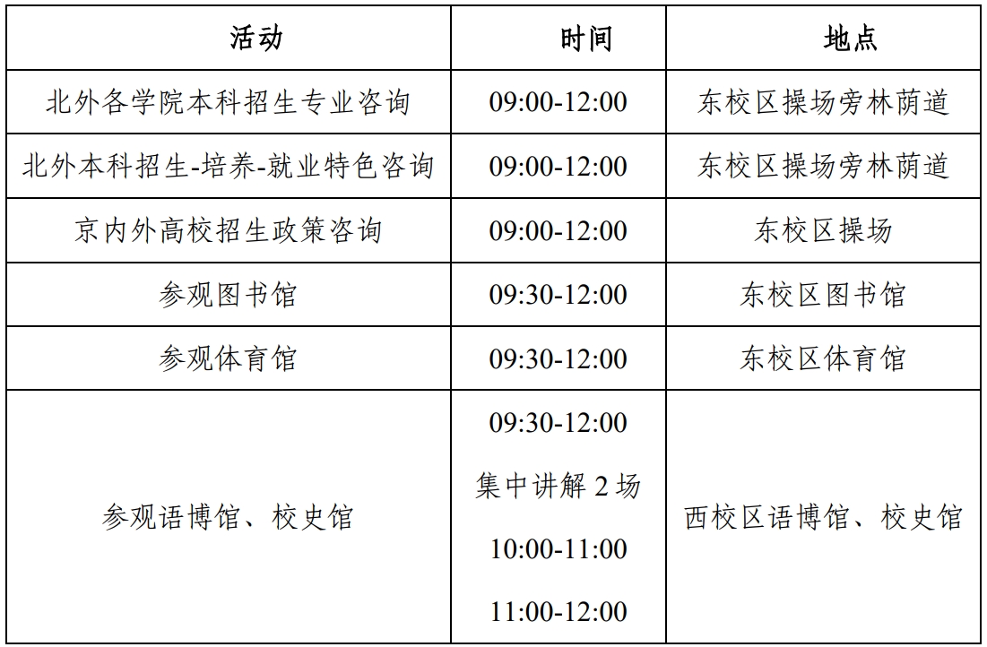 为了让大家深入了解我校2026年本科招生政策和学科建设、办学特色、校园环境,我校将于4月11日(周六)上午举办2026年北京高招大型咨询会暨北京外国语大学校园开放日活动。届时会有70余所京内外高校在东校区操场设置招生咨询展台,解答考生和家长的各类问题。同时,当天是北外校园开放日,所有招生学院将派专人解答2026年本科招生专业情况及招生政策,学校图书馆、世界语言博物馆、校史馆、体育馆等将向考生及家长开放。